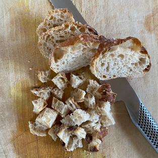 Croutonerne er færdige når de er brune/gyldne på overfladerne.